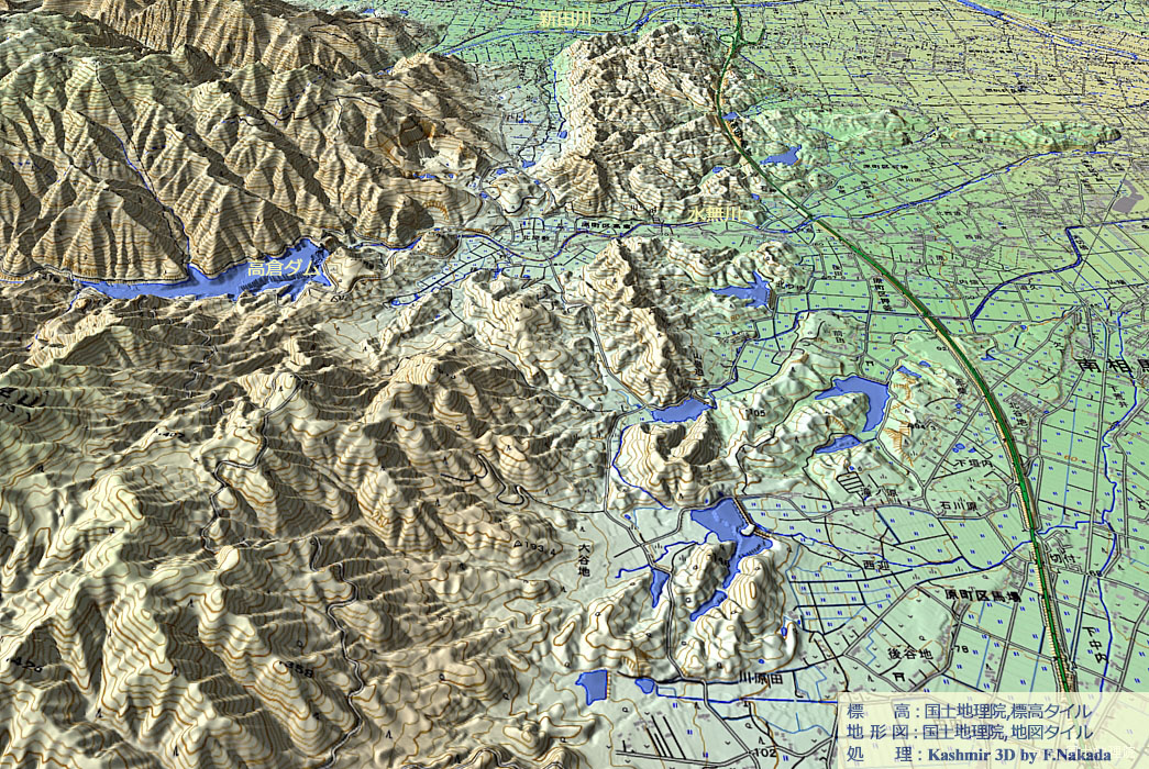 | 地形と活断層図の三次元イメージ : 宇多川とその周辺部の双葉断層 |
