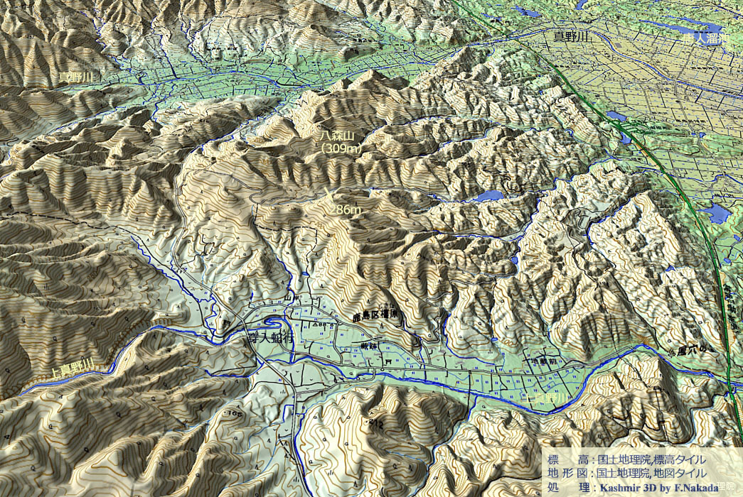 ‼マウスオーバー‼ 地図上にマウスを乗せてください。国土地理院の「都市圏活断層図(出典,下記)」を表示します。![]() 南相馬市の「上真野川」~「真野川」の区間で,「活断層」に認定されている区間です。 断層の右側(東側)には,「八森山(309m)」や「286m峰」があるので,一見すると東側隆起の断層のように思える区間です。 |