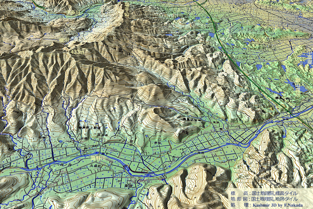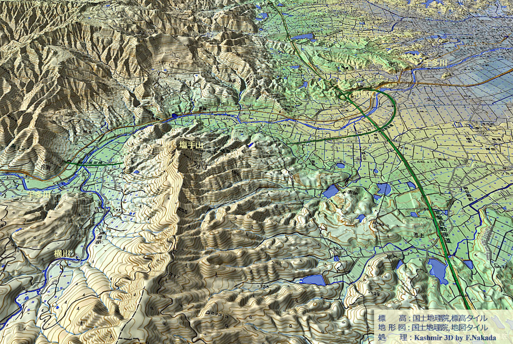 ‼マウスオーバー‼ 地図上にマウスを乗せてください。国土地理院の「都市圏活断層図(出典,下記)」を表示します。![]() 南相馬市の「真野川」付近から北方を俯瞰したイメージです。 「塩手山」から「433m峰」へと続く主山稜から東に分かれる尾根のほぼ全てには,「双葉断層」によって形成された「断層鞍部」が存在しています。 また双葉断層の西側は急激に隆起しているので,一見するとケスタ地形のようにも見えます。 |
