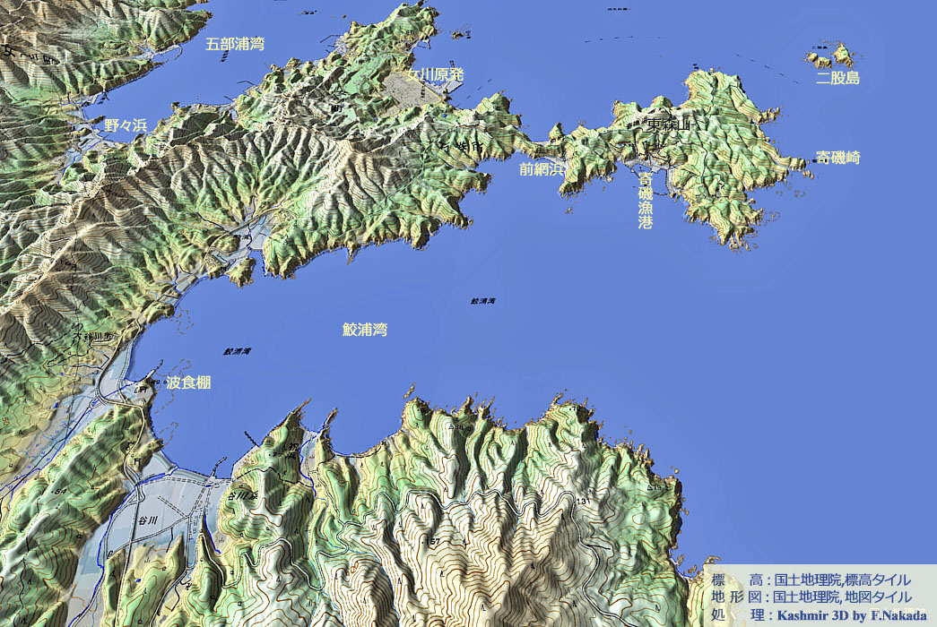 ![]() この「大原湾」も「萩浜湾」に負けず劣らずの「リアス海岸」です。 尾根が水に浸かっている状態,と言えるでしょう。 |