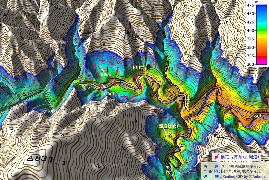 | 地形の三次元イメージ : 穿入蛇行跡と推定環流丘陵 |