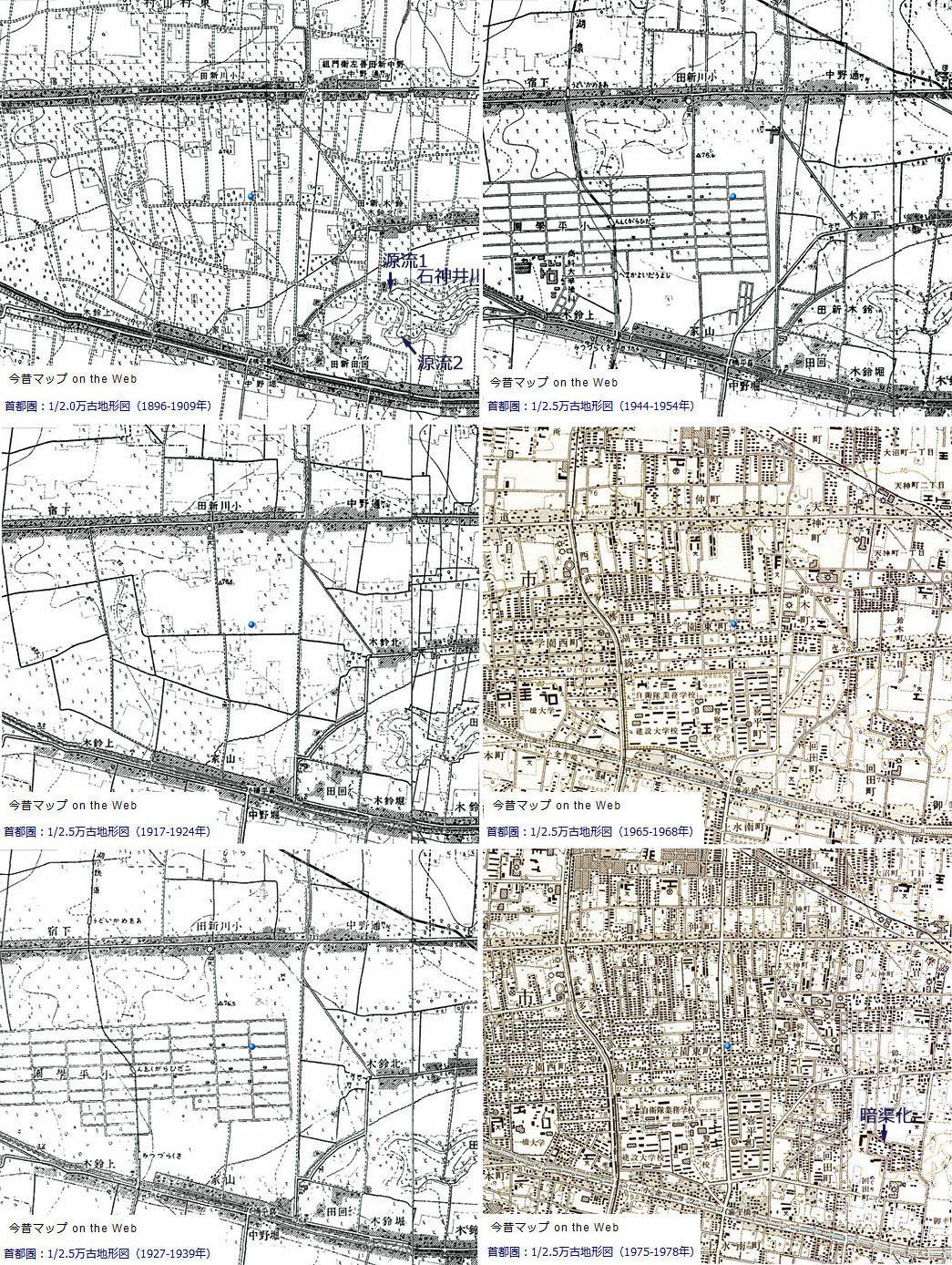 ![]() 「青色マーカー」は,全て同じ位置(緯度・経度)を示しています。 小平市の地形図を見ていると,戦後15年経った1960年ごろに劇的変化が現れました。それは, ① 五日市街道沿いの地名「小川新田」が消滅し,「仲町」という新町名に変わる。 ② 同じく,町名「小平学園」が分割され,「学園東町」と「学園西町」へと変わる。 ③ 西武多摩湖線の「小平学園駅」と「商大予科前駅」が統合し,「一橋学園駅」が新設される,などです。 |