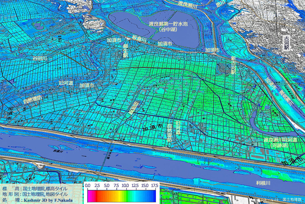 ‼マウスオーバー‼ 地図上にマウスを乗せてください。国土地理院の「地水地形分類図(出典,下記)」を表示します。![]() 関東平野北部で,西から東に流れる利根川の右岸側(南側)は「埼玉県」のはずなのですが, 渡良瀬貯水池の所では,「埼玉県加須市」が利根川の左岸側(北側)に大きく「Ω状」に張り出しています。 これは,昔の利根川の分流の一つが,今の渡良瀬貯水池付近を流れ,北からの「渡良瀬川」と合流してから,利根川の本流に戻っていたためです。 その飛び出た部分に,もう一つの「Ω」が存在します。 こちらも利根川の分流の一つなのです。 利根川は随分と自由な場所を流れていたようですね。 |