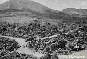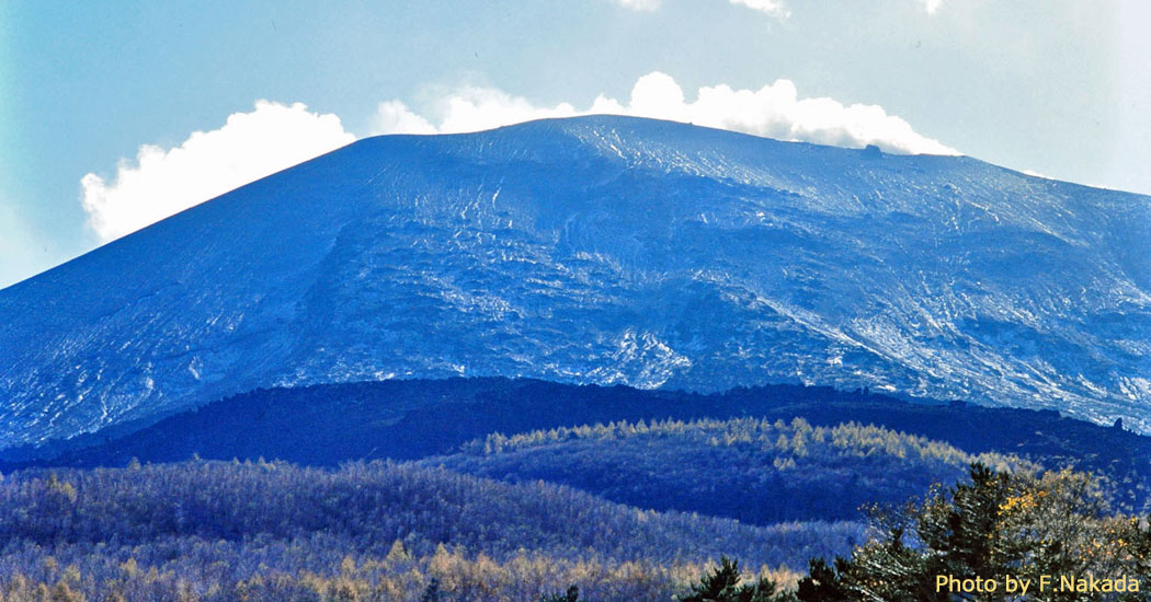 ![]() 群馬県北軽井沢の地蔵川地区から撮影した,中央火口丘の「釜山」です。 朝日の当たっている凹凸の岩は,ぼ全て「鬼押出溶岩」です。 釜山の北側火口壁にある黒い塊は,空中写真にも写っているほどの巨岩で,もちろん現在もあります。 白い雲は,山頂火口からの水蒸気です。 |