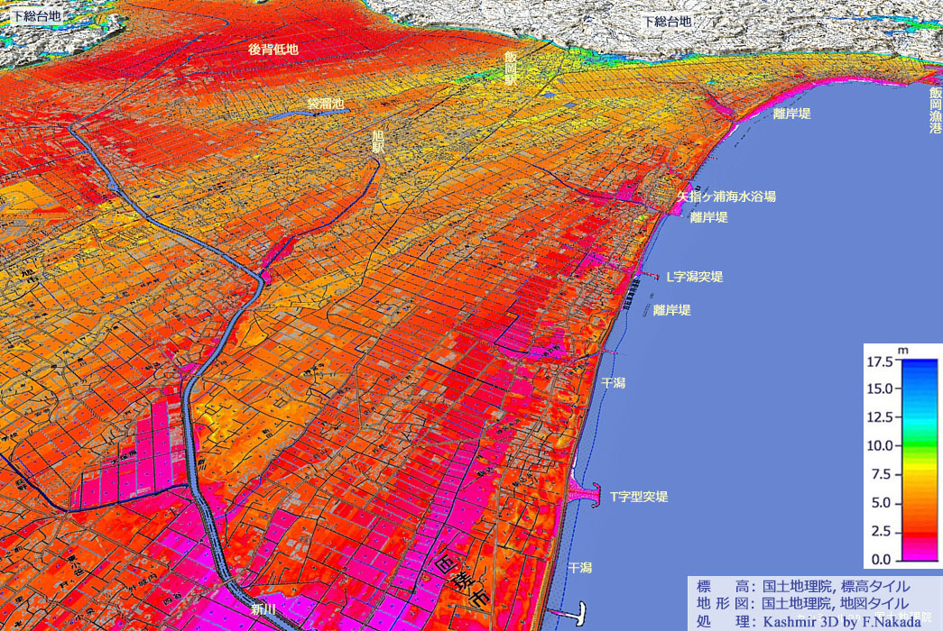 | 標高段彩図と地質の三次元イメージ : 九十九里海岸(飯岡漁港~新川近傍) |