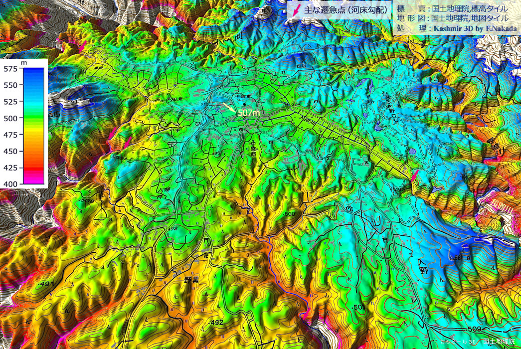![]() 山などが降雨などの侵食作用を受けて高さが海面近くまで低くなり,殆ど平坦になった地形のことを「準平原」と言います。 「久田見高原」は標高が500mほどありますから,平坦になった後現在の高さまで隆起したことになり,これを「隆起準平原」と言います。 比高300m~360mという急崖に囲まれている高原のため,河川の浸食がかなり進んでいます。 「木曽川」支流の「旅足川」,その孫流?の「無名川(資料無し)」などには,「河床勾配」が急変する「遷急点」が存在します。 これらの遷急点は新たな「谷頭」とも言うべき場所なので,準平原に懸かる滝のような場所でもあります。 |