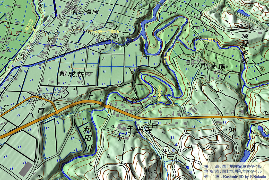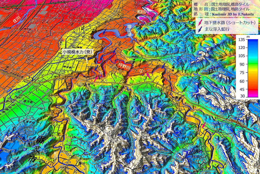 ![]() 地形図によると,「和田川」の支流の「坪野川」には,2か所の「(地下)捷水路」が存在します。 「②」については,地形図ではトンネルとして記載されていますが,GoogleMapsの空中写真では「水路」が写っています。 また,標高データからも「凹地」が確認できるので,「②」は普通の捷水路と判断できます。 一方,「③」については,地形図や空中写真から「地下捷水路」であると判断できます。 |
