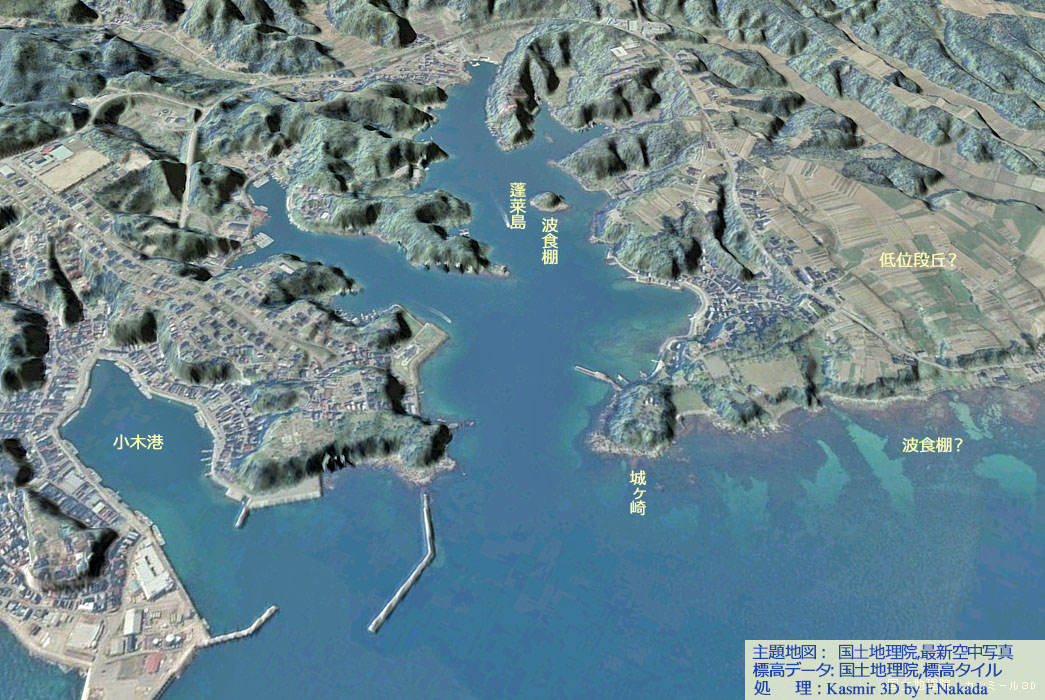 ![]() 空中写真で観察すると,「城ヶ崎」近くの海中には,複数の岩礁らしき影が存在しています。 かつての陸地の名残のようにも思えます。 また,「九十九湾」の中にも,複数存在する小さな岬の延長上の海中に,「波食棚」と思われる地形が存在しています。 元々尾根だった場所に海水が近づいたため,波による侵食と,波によって移動する礫などの研磨作用も加わって,「波食棚」が生まれたのでしょう。 この付近は,沈降性の大地なので,海面が下降する場合を除いて,波食棚らしき場所が再び陸地化することは無さそうです。 |