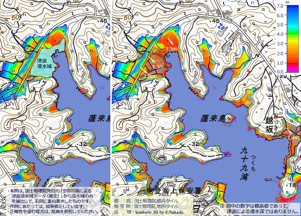![]() 「九十九湾」の湾奥では,標高が約1.8mの土地の周辺まで,「令和6年能登半島地震」による津波で浸水しました。 一方,湾口近くの標高約1.5mの土地は,浸水を免れたようです。 |