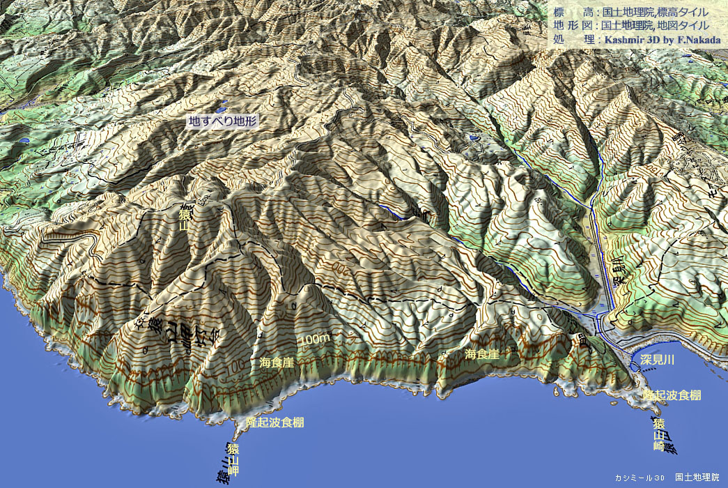 | 地形の三次元イメージ : 猿山岬付近の海食崖 |