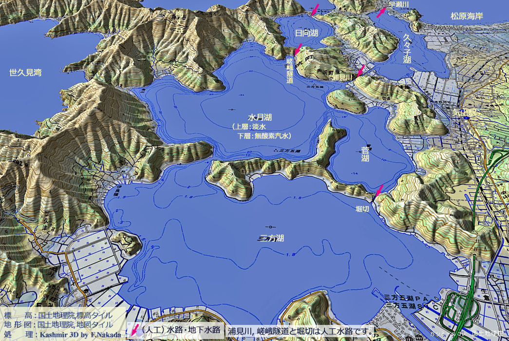 ![]() 三方五湖を河川的に見た場合,鰣川(はすがわ) → 三方湖 → 水月湖 → 浦見川 → 久々子湖 → 早瀬川 → 若狭湾,という経路で排水されています。 ここで重要なのは,三方湖が巨大な調整池の役割を担っている,ということです。 すなわち,鰣川に洪水があったとしても,三方湖の調整能力で水月湖には大きな擾乱が届かない,ということです。 このため,水月湖の湖底には過去7万年分の「年縞」が堆積し続けることができました。 注 年縞ができる理由は,上記のほかに,三遠三角地の沈降運動,表面が淡水で湖底が無酸素の汽水,などが重なった結果です。 |