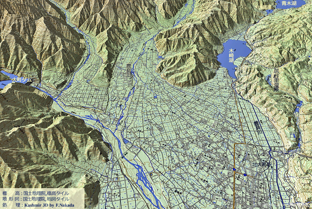 | 地形(標高段彩図)の三次元イメージ : 高瀬川扇状地 |