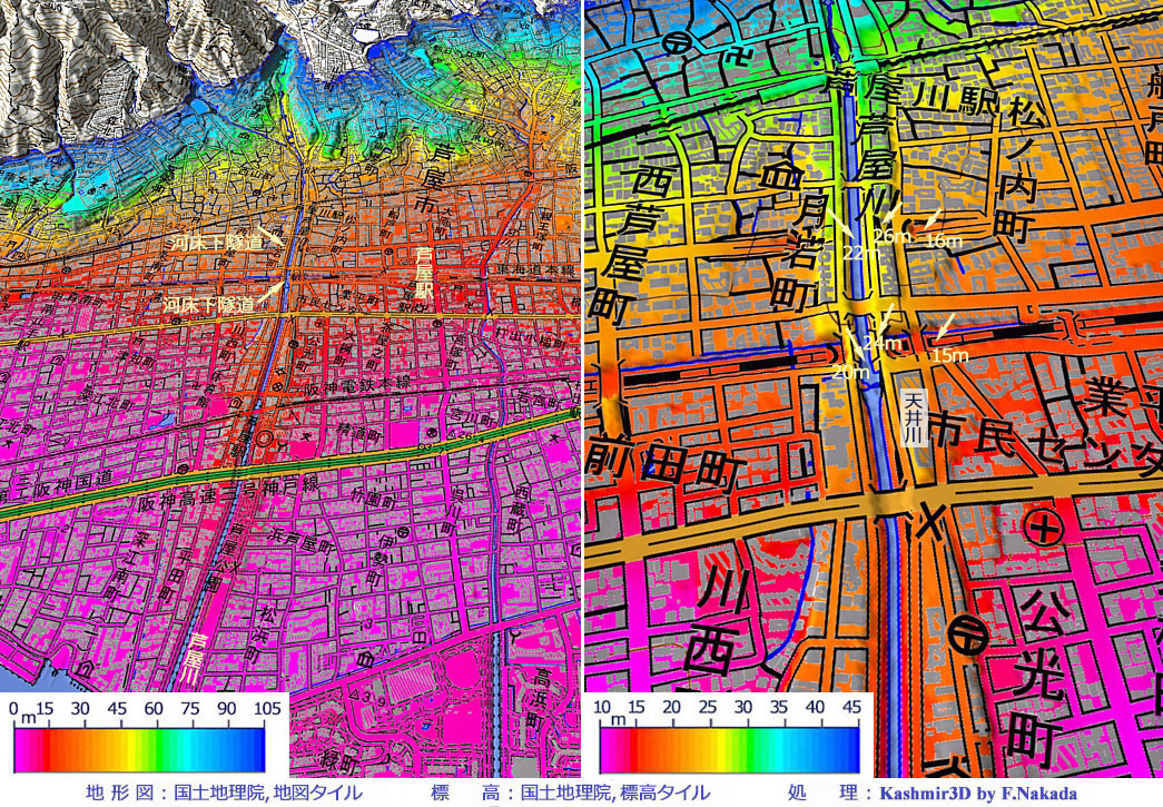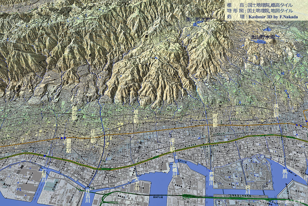 | 地形(標高段彩図)の三次元イメージ : 天井川の芦屋川 |