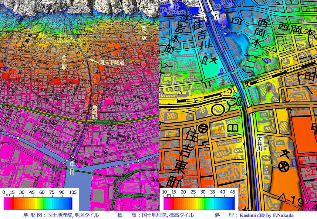 | (標高段彩図)の三次元イメージ : 天井川の住吉川 |