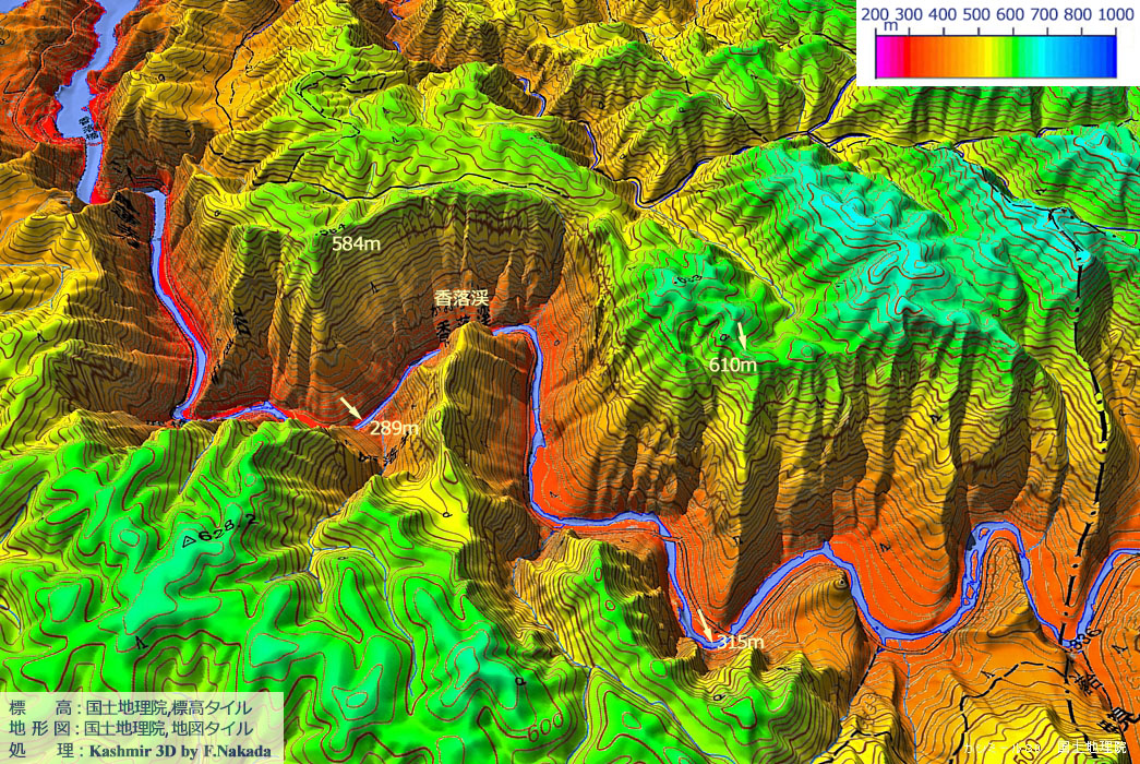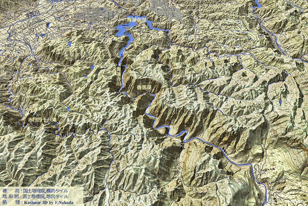 | 地形(標高段彩図)の三次元イメージ : 香落渓(かおちだに) |