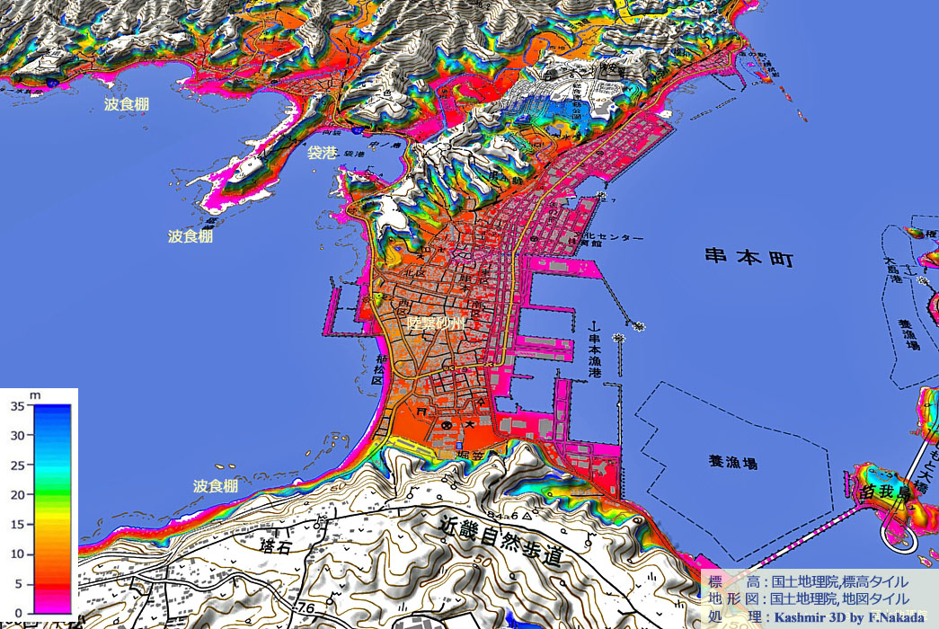 | 地形(標高段彩図)の三次元イメージ : 串本港(陸繋砂州) |