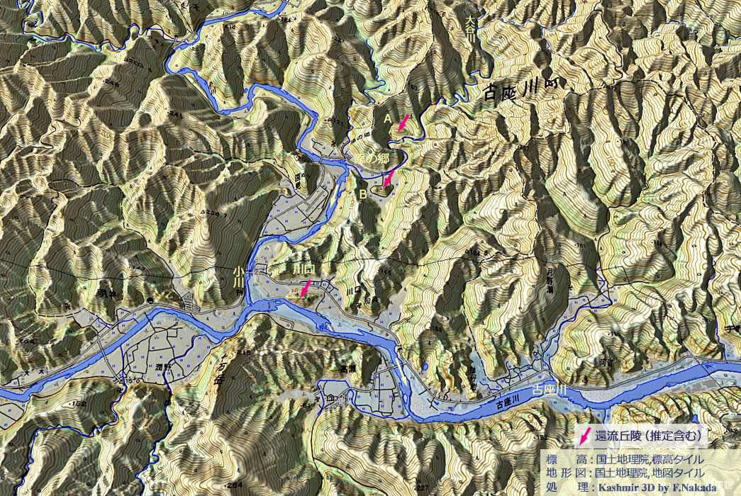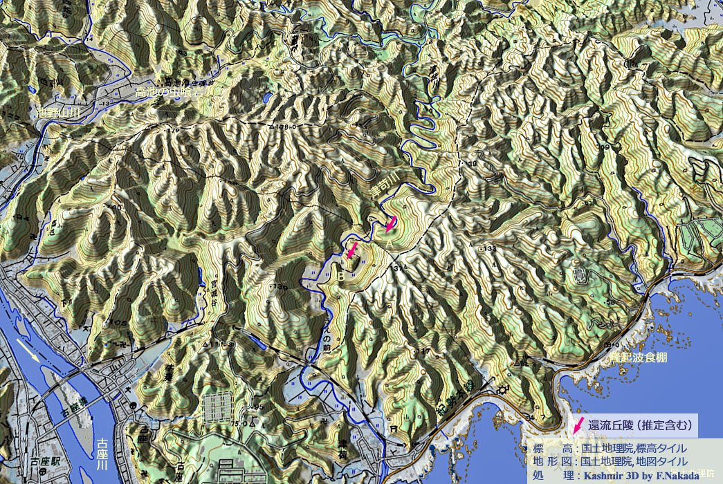 | 地形と地質の三次元イメージ : 古座川と大谷川の環流丘陵 |