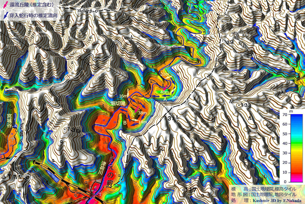 | 地形の三次元イメージ : 津荷川の人工的な環流丘陵 |