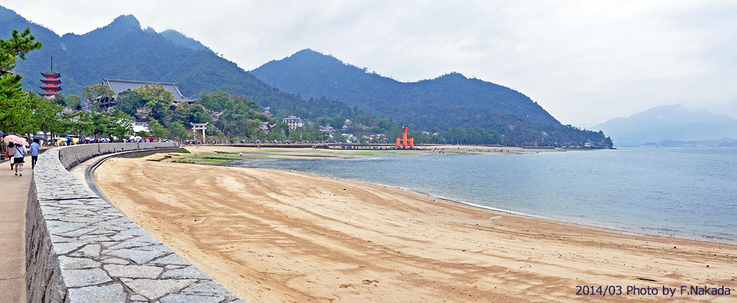 ![]() 大鳥居が浮かぶ「干潟」は,宮島を覆うマサが大雨の時に流れ出して海に運ばれたものです。 従って,仮にマサの流出を防止するための砂防工事を行うと,干潟が痩せてきて大鳥居に悪い影響が出る,可能性があります。 なお,「清盛神社」が立地しているのは,干潟が進化?した「砂州」です。 |