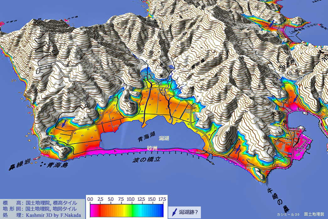 ![]() 「岩石海岸」が続く「青海島」で,この「青海湖」の前面が島で唯一の「砂州」が発達した場所です。 資料によると,砂州を構成する物質は砂では無く,直径50mmの「円礫」とのことです。 正しくは「礫洲」と呼ぶべきでしょう。 本州側の「仙崎砂州」と同じ沿岸流の仕業だと思われますが,どこから運ばれてきたのでしょうか。 なお,現在の砂州(礫洲)には,無数の「突堤」が建設されています。 礫の供給がほぼ途絶えている,ことを示しています。 なお,青海島の南東部で,「潟湖跡」と思われる場所が4箇所存在します(確証はありませんが)。 |