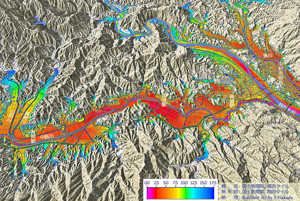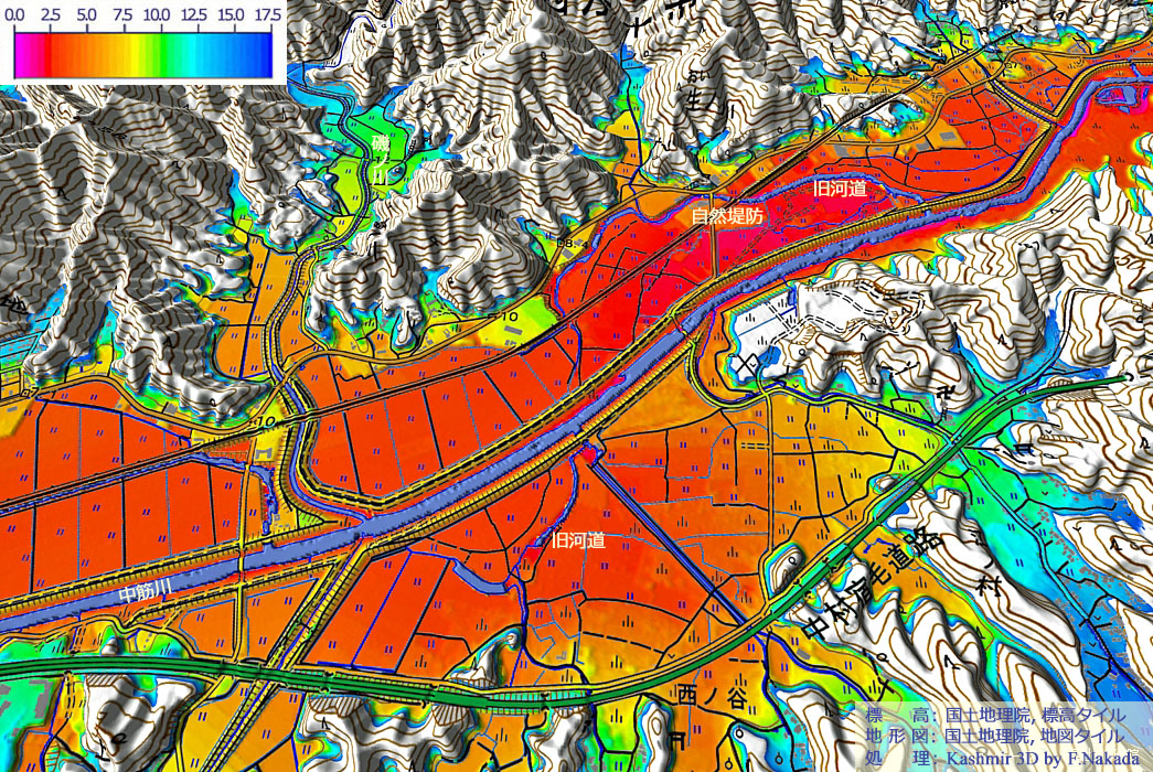 ‼マウスオーバー‼ 地図上にマウスを乗せてください。国土地理院の「治水地形分類図(出典,下記)」を表示します。![]() 「四万十川」の支流「中筋川」は,「中筋地溝帯」と呼ばれる低地を流れています。 その流域の特徴は,以下のようにまとめられます。 ① 川の流れが非常に緩やか(超緩流性)であること。 ② 谷底平野の標高を見ると,本流との合流点付近よりも,上流部に最低部が存在すること。 ①と②から導き出されることは,中筋川下流の「谷底平野」は,四万十川本流の「後背低地」であって,本流の水位が上昇した時には, 必ず「中筋川に背水(バックウォーター現象)による洪水が発生」すると思われます。 十分な注意が必用です。 |