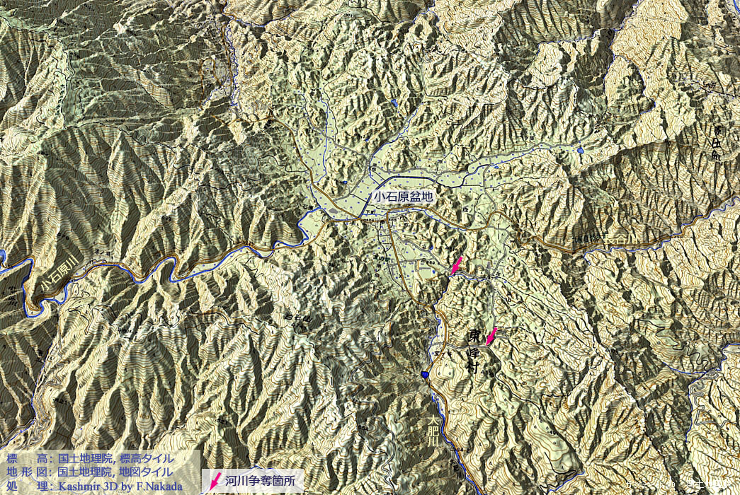 | 福岡県:小石原盆地における小石原川と大肥川の河川争奪 |