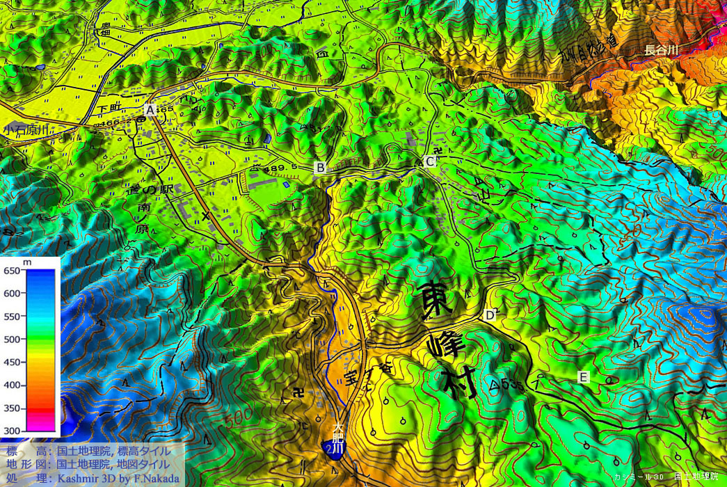 | 地形(標高段彩図)の三次元イメージ : 小石原川と大肥川 |
