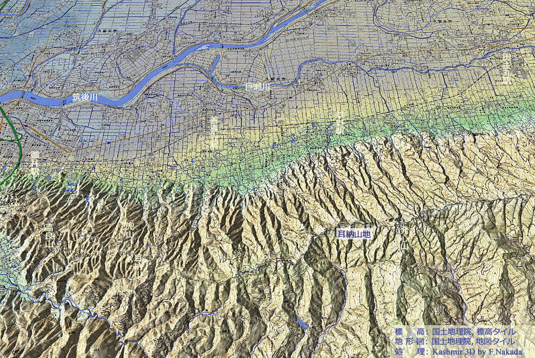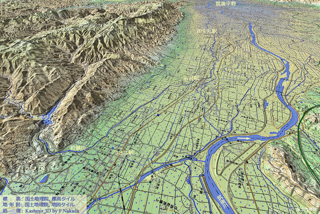 | 地形と地質の三次元イメージ : 耳納山地(東側)と筑後川流域 |