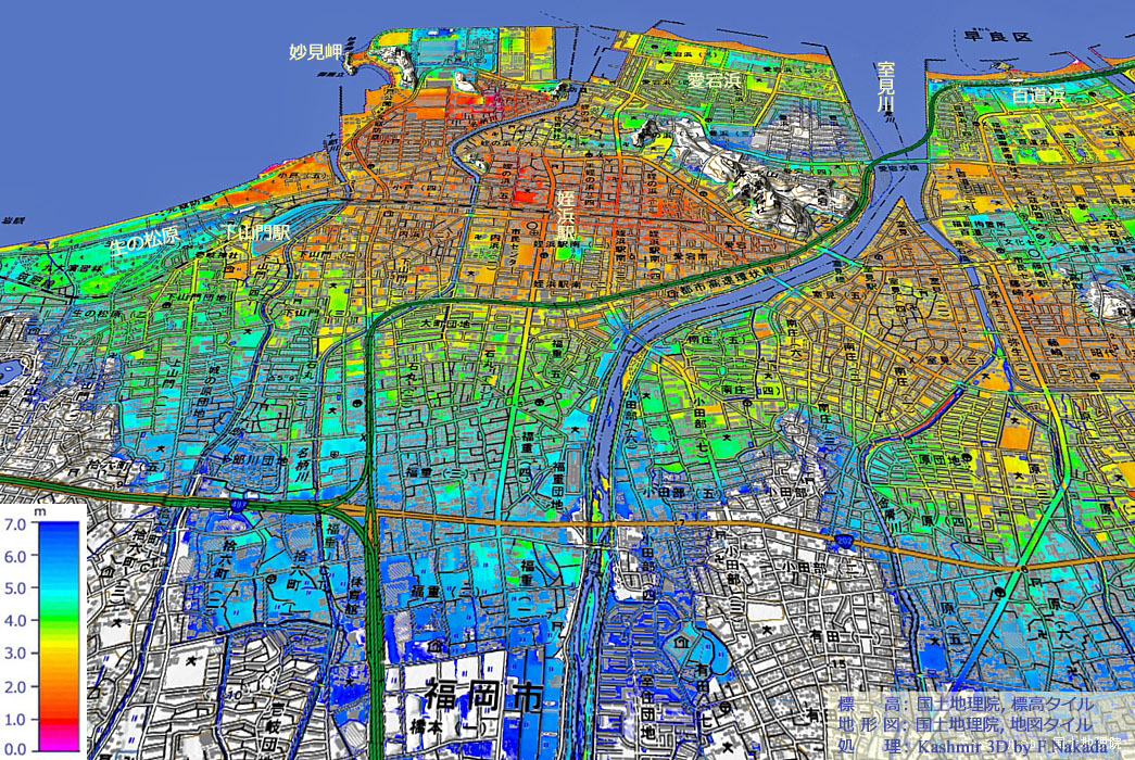 | 地形(標高段彩図)と地質の三次元イメージ : 姪浜(めいのはま)~生の松原(いきのまつばら) |