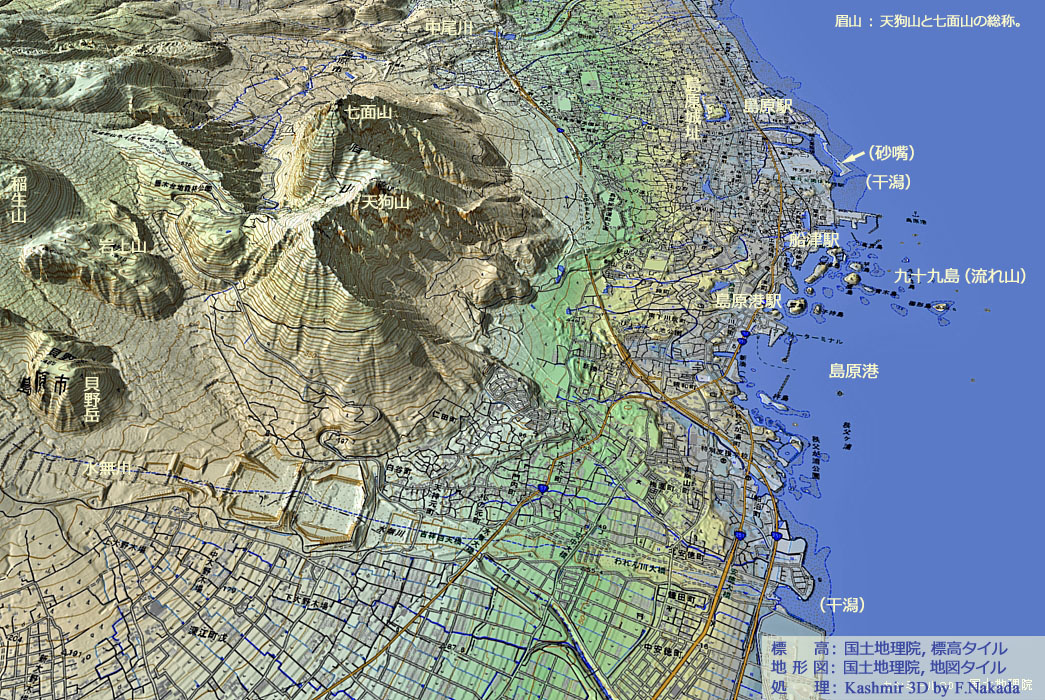![]() 「島原大変肥後大迷惑」と言われた「大災害」は,1792年に発生した「眉山・天狗岳」の「山体崩壊」とそれに伴う「岩屑なだれ」と「大津波」のことです。 なお,同じ眉山に属する「七面山」の斜面も,侵食によってかなり大規模な「山崩れ」が発生しており,山麓には「扇状地】が発生しています。 |