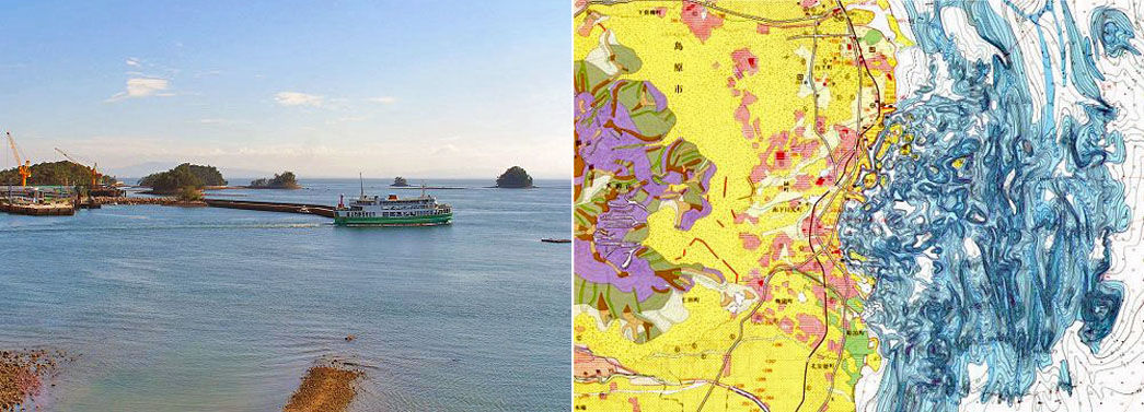 ![]() (左)九十九島(写真A)。 (右)沿岸海域土地条件図「島原」(出典,下記)。 |