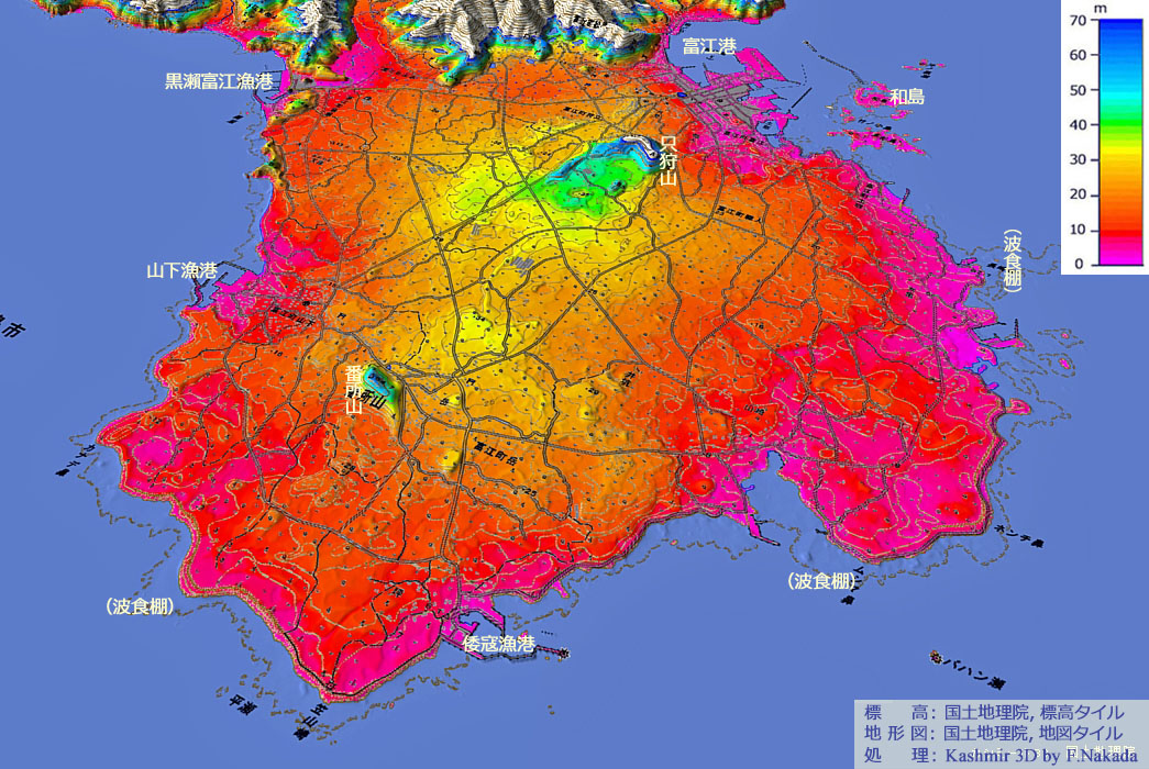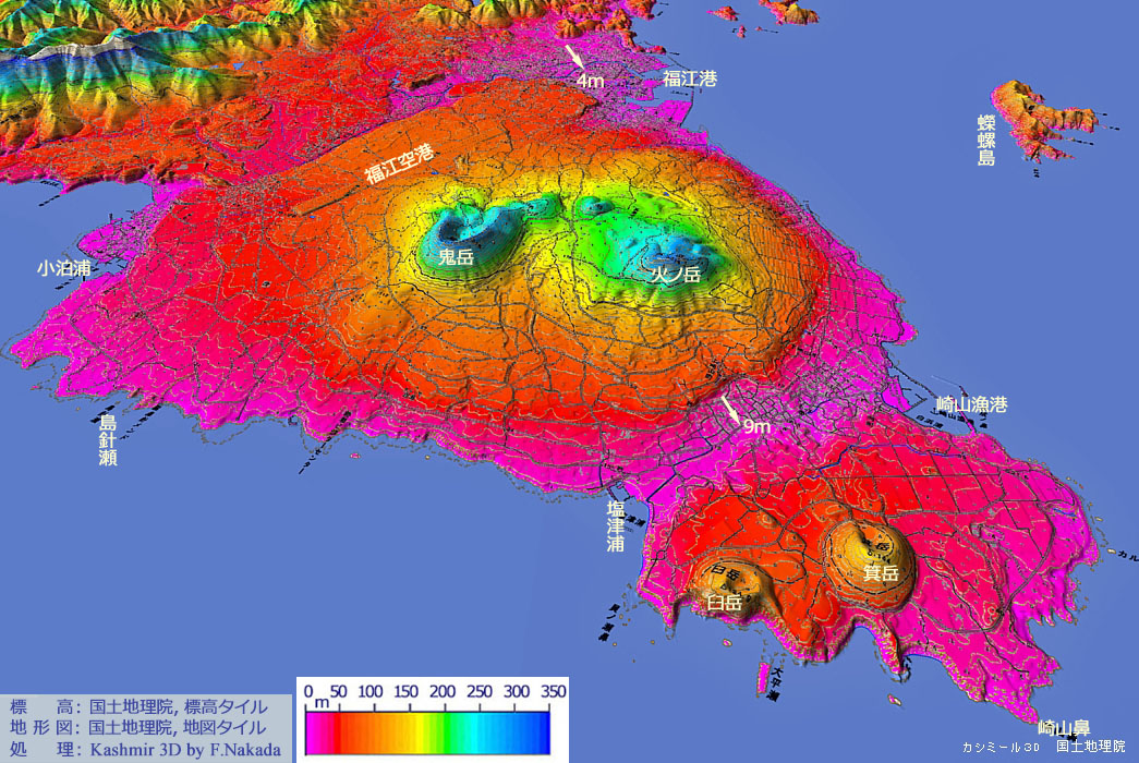 | 地形と地質の三次元イメージ : 富江火山群,鬼岳(おんだけ)火山群,三井楽火山群 |