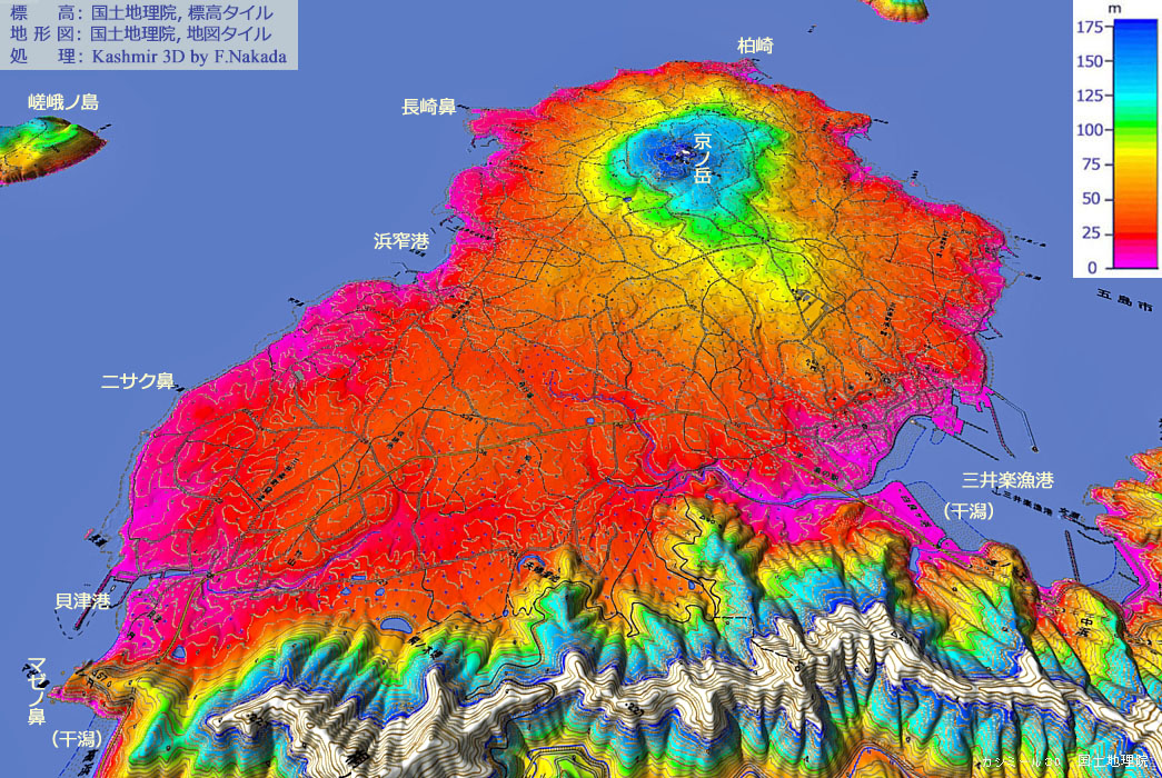 | 地形(標高段彩図)の三次元イメージ : 三井楽火山群(京ノ岳) |