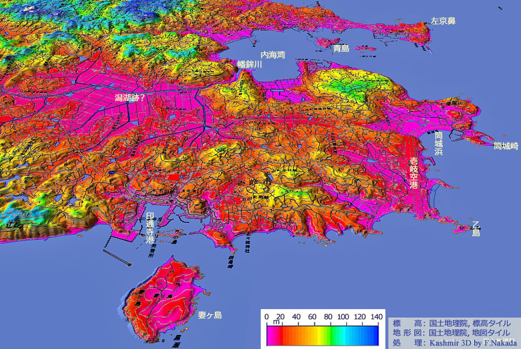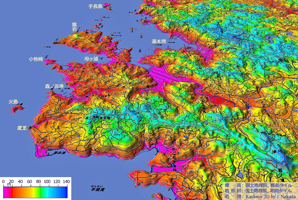 | 地形(標高段彩図)の三次元イメージ : 壱岐島,南東部 |