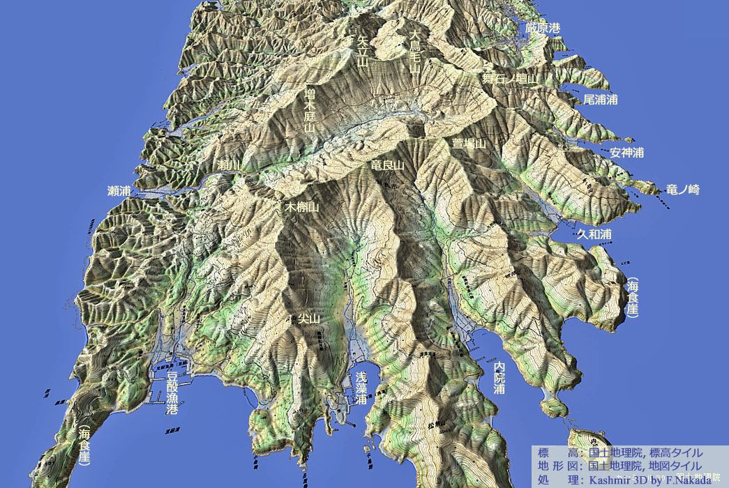 ‼マウスオーバー‼ 地図上にマウスを乗せてください。産総研・地質調査総合センターの「1/20万 地質図幅『厳原』(出典,下記)」を表示します。![]() 下島南部の地質も基本的に「対州層群」ですが,「瀬川」の流域など各所に「花崗岩」が貫入しました。 また,その周辺は花崗岩の熱により,硬い「ホルンフェルス」という「変成岩」へと変化しました。 「泥岩・砂岩」からなる「対州層群」の場所と,「花崗岩」や「ホルンフェルス」の場所では,地形が大きく異なっています。 対州層群: 小振幅で密度の高い山襞構造を呈し,主稜と呼べるような尾根が少なくなっています。 花崗岩・ホルンフェルス:直線状で幅が広いの尾根と谷を持ち,数本の主稜と呼べる大きな尾根が存在します。 |