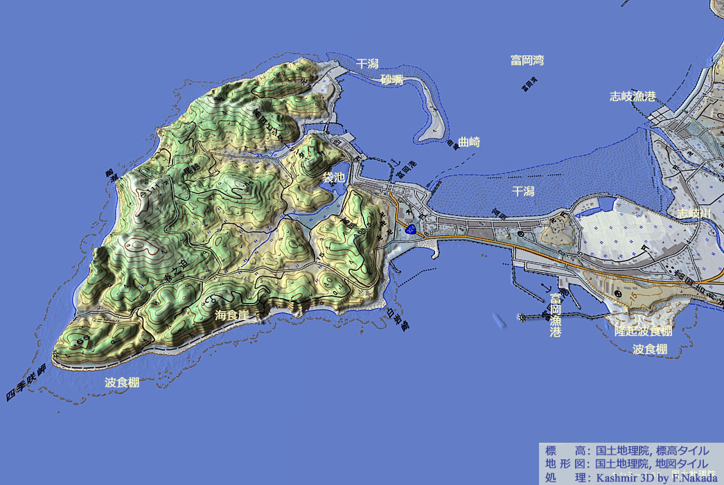 | 地形の三次元イメージ : 陸繋島の富岡半島 |