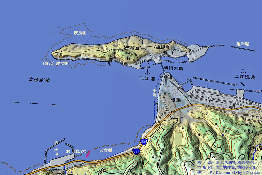 ![]() 通詞島の西側には「波食棚」が広がっています。 もう間もなく「西河内港」と言う波食棚の一角に, 「おっぱい岩」と名付けられた円錐形の大岩が転がっています。 |