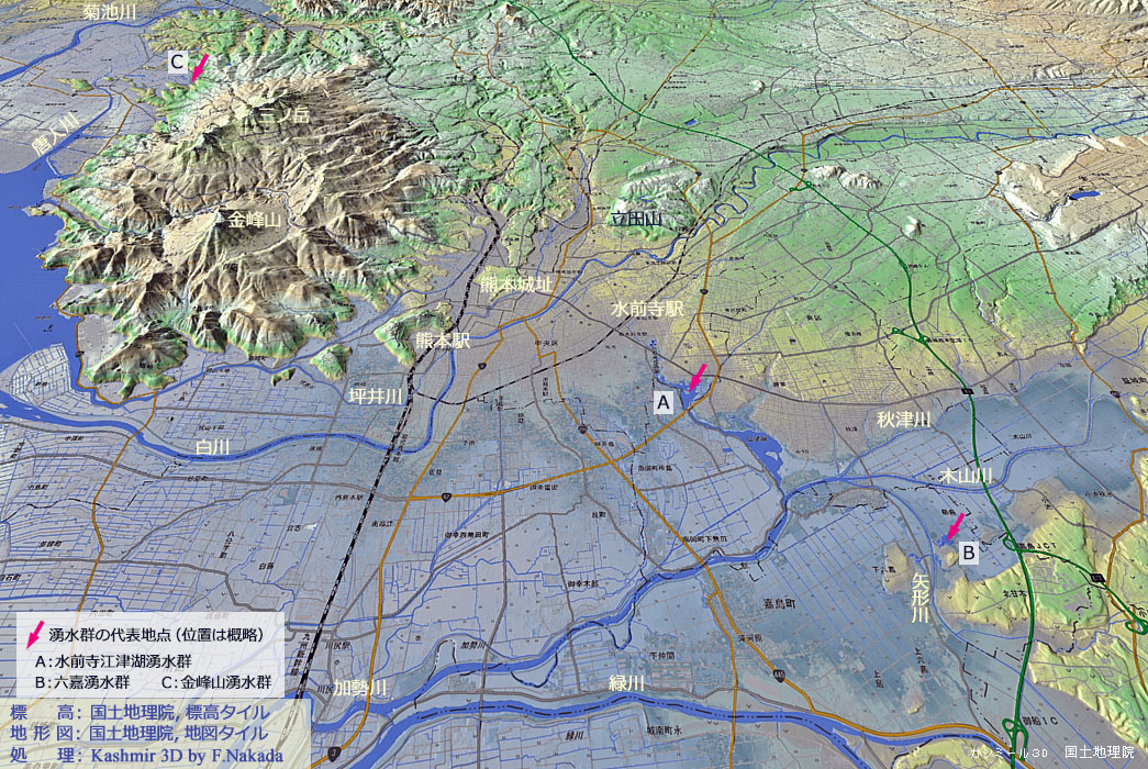 | 地形と地質の三次元イメージ : 熊本市近郊の湧水群[事務局作成] |