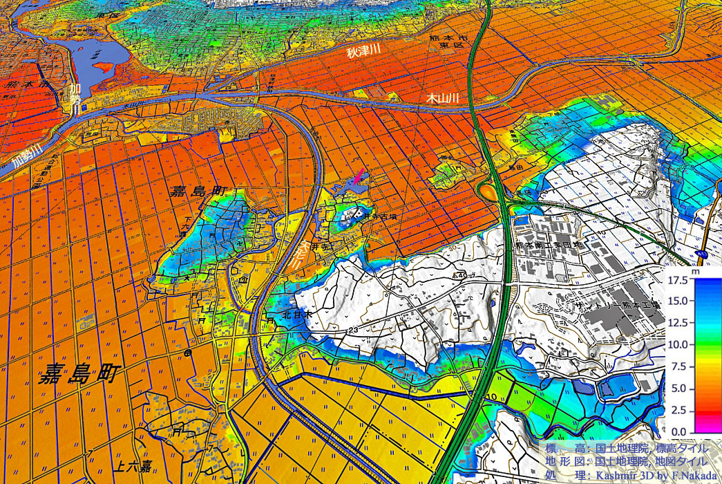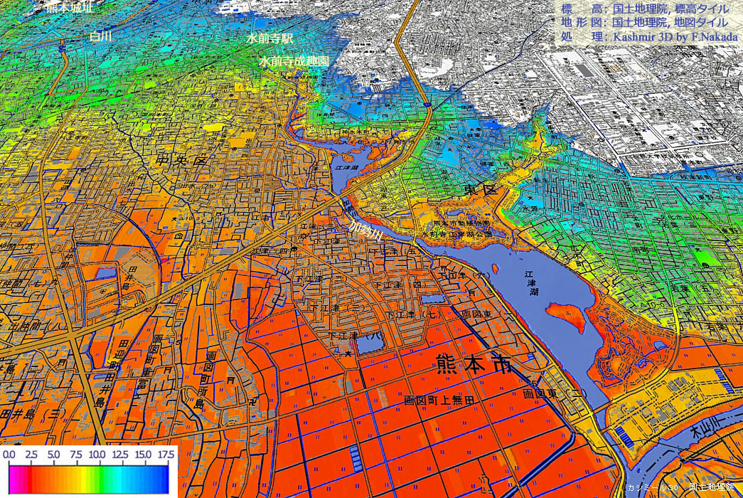 | 地形の三次元イメージ : 江連湖湧水(水前寺江津湖湧水群) |