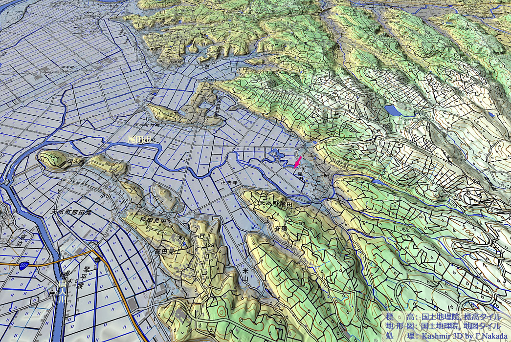 | 地形の三次元イメージ : 尾田の丸池湧水(金峰山湧水群) |