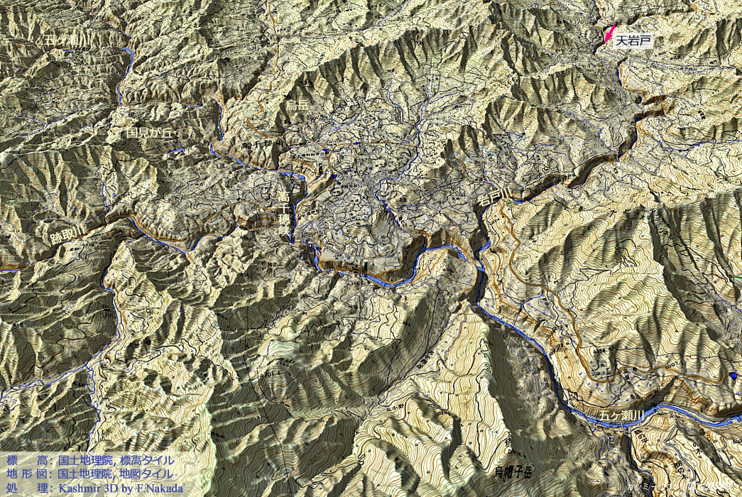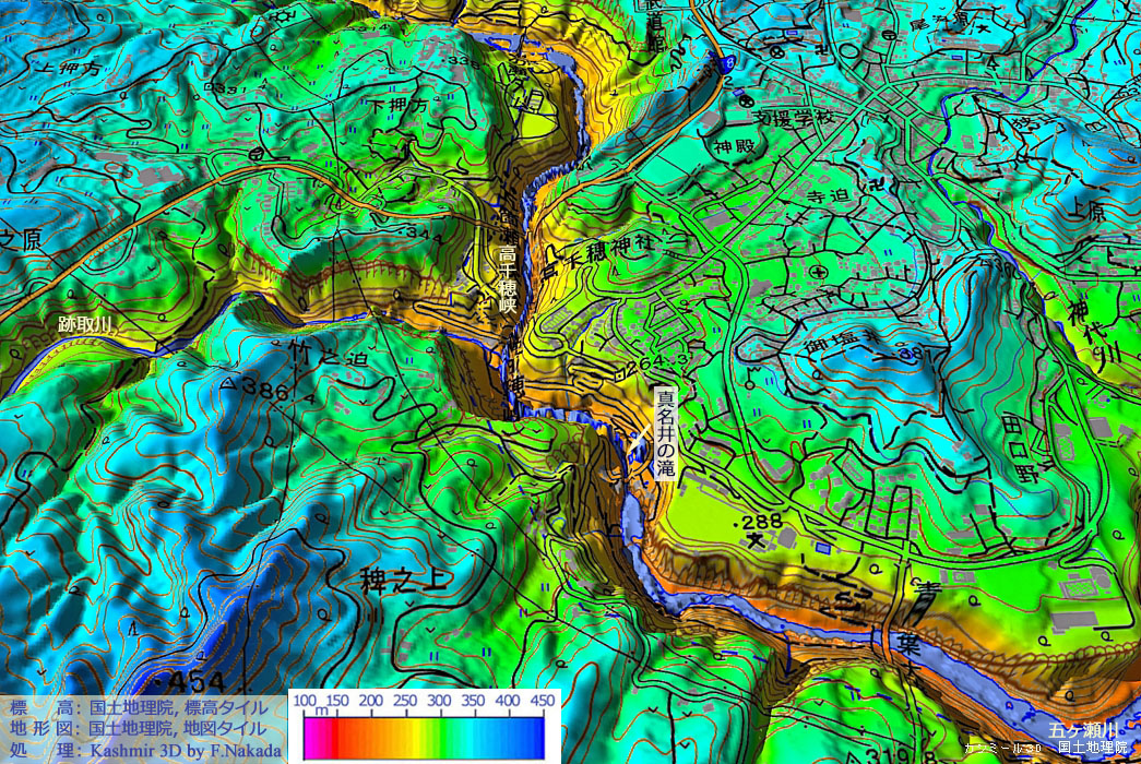 | 地形(標高段彩図)の三次元イメージ : 高千穂峡 |
