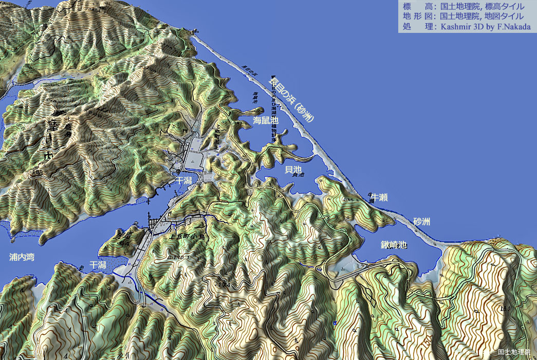 | 三次元地形モデル : 須口池と陸繋砂洲 |