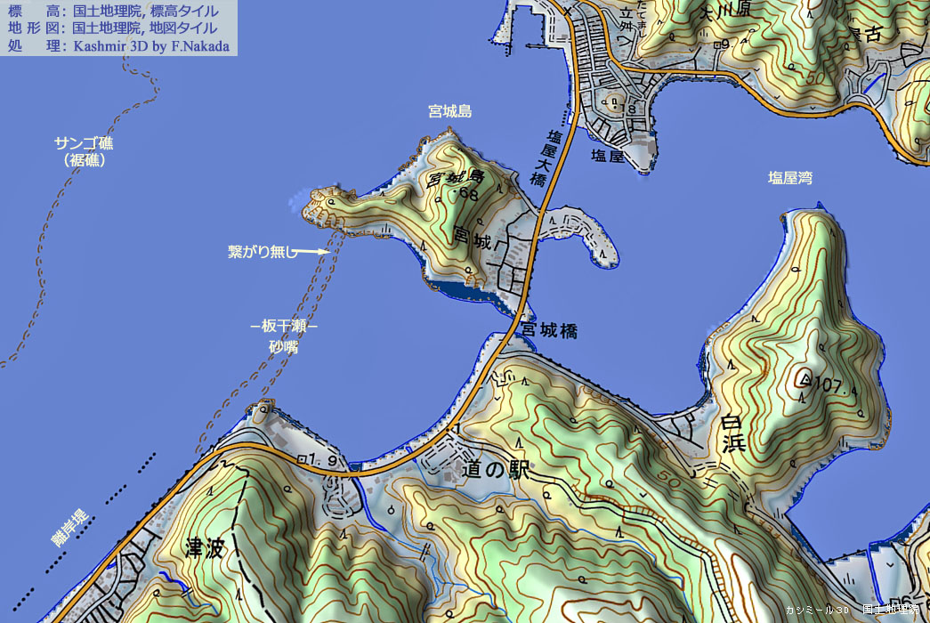 ![]() 「大宜味村津波」の小さな岬から,塩屋湾口の「宮城島」に延びる「砂嘴」に「板干瀬」があります。 なお,この砂嘴は,宮城島の手前で途切れていますが,地形図では繋がっているように記載されています。 |