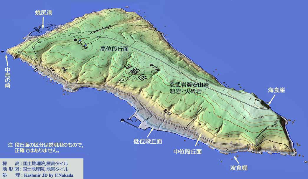 ![]() 噴火口の位置は特定されていませんが,「屏風岩展望台」近くが最も高くなっているので,この付近の可能性があります。 島の北西側の海岸は,高さが150mにも及ぶ「海食崖(断崖絶壁)」なので,ウトウやケイマフリなど,(固有)海鳥の営巣地となっています。 これに対し,東側には中位の段丘面が残っているなど,海食の程度は緩やかです。 火山の西半分が削り取られてしまった,と想像しますが,もちろん何の確証もありません。 |