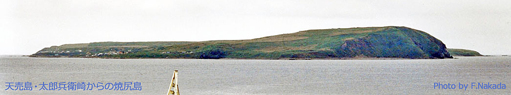 ![]() 焼尻島の海食崖(断崖絶壁)は,島(写真)の右端部のみです。 残りの火山体は,激しい波で削られて,ほぼ平らになってしまったようです。 |