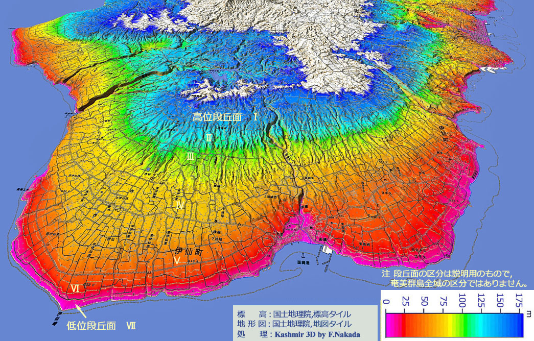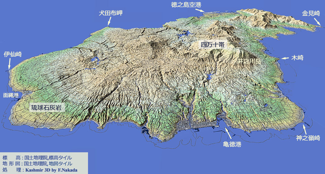 ![]() 「徳之島」の基盤は,主として四万十帯(四万十累層)の「白亜紀付加帯」と古第三紀暁新世の「花崗岩類」です。 島の東部~南部~西部にかけての海岸部分には,新第三紀更新世の「琉球層群(琉球石灰岩,礫,砂)」が, 古い年代の山々の山すそを取り囲むようにして,「海成段丘面」を形成しつつ分布しています。 |