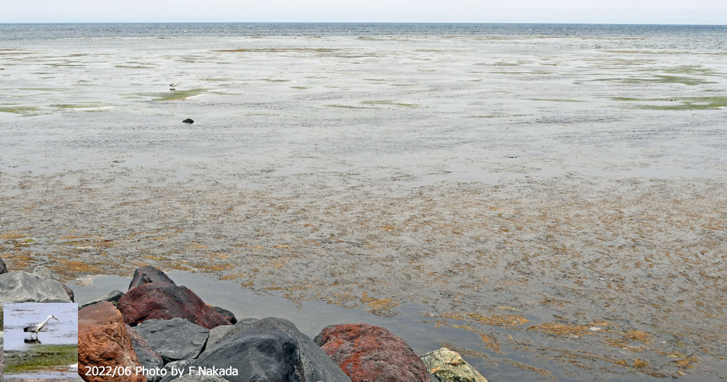 ![]() 干潮時の「宗谷岬」そばの海岸です。 アオサギの足元から,この場所の水深は,10cm程度であることが判ります。 |