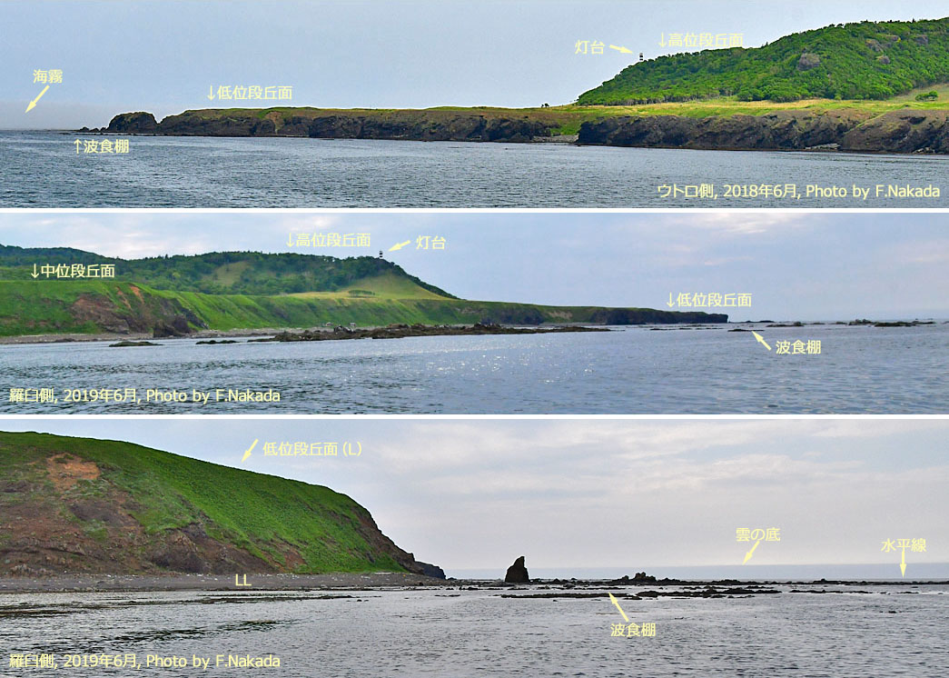 ![]() 「中位段丘面(M)」は,羅臼側にしか存在しません。 また,「波食棚」も,面積的には羅臼側の方がはるかに広大です。 |