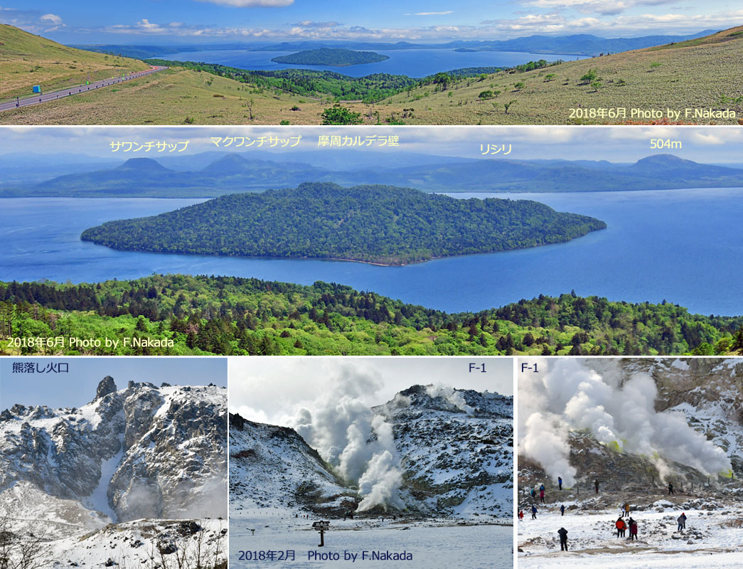 ![]() (上)美幌峠からの屈斜路カルデラ全景。20mmレンズを使用し,後に3枚を連結しました。 (中)美幌峠からの中ノ島とアトサヌプリ火山群。 (下)アトサヌプリ(硫黄山)の「熊落し噴火口」と「F-1噴気孔群」。 噴火口は川湯温泉駅で撮影しました。 |