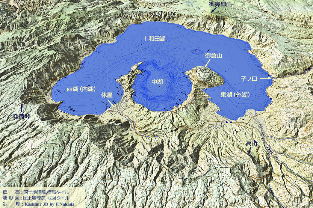 ![]() 約5400年前の噴火でできた「中湖カルデラ(火口)」です。 北側の壁が吹き飛んだのでしょうか,水深図によると北に向かう谷地形となっています。 元々の「十和田カルデラ(湖)」の水深は,最深でも100mぐらいなので,中湖カルデラの-320mは「マグマ水蒸気爆発」によるものと考えられます。 平安時代の915年(延喜14年)に噴火したことが記録に残っているので,最終の火山地形はこの時に形成されたと思われます。 |